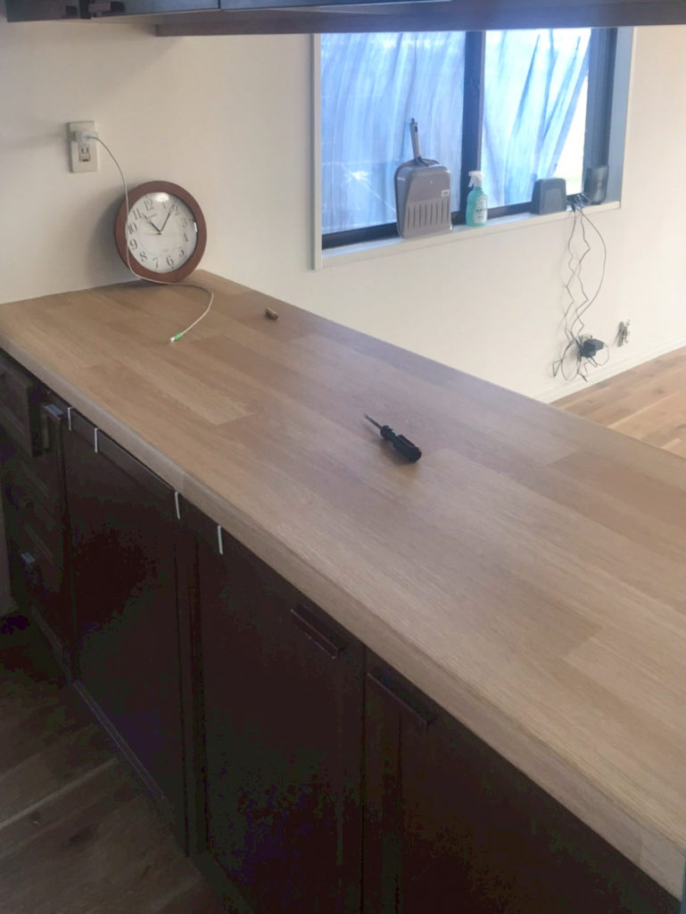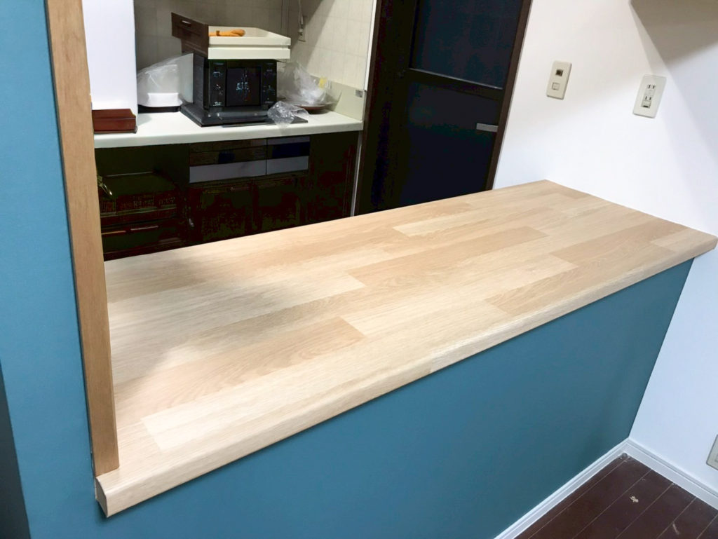 | ご要望 | 愛犬が子犬時代にフローリングを傷付けてしまい、成長していたずらをしなくなったので綺麗にしたい。 フローリングだとペットの身体に負担がかかるのでクッションフロアを貼りたい。 キッチンカウンターを木目にしたい。 |